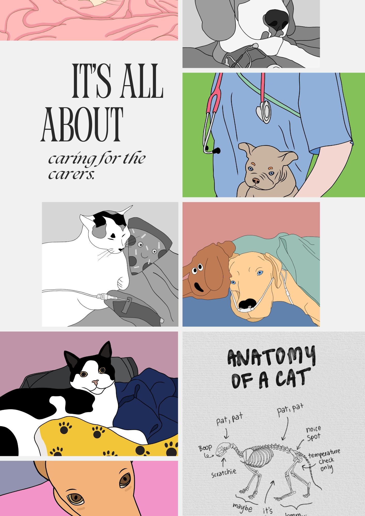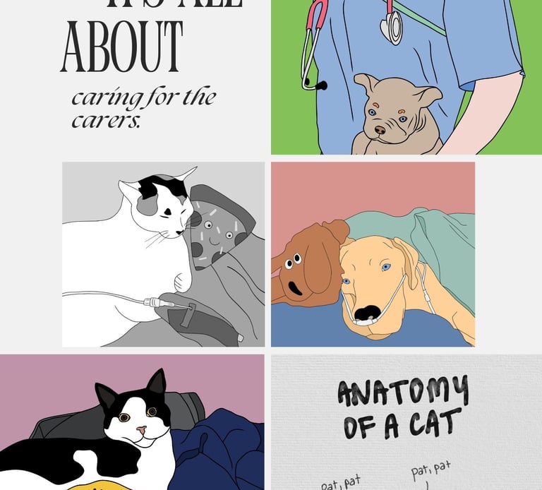 At Paws & Poppets, we create thoughtful veterinary and medical illustrations inspired by real clinical experience. Our designs blend empathy, gentle humour, and a genuine understanding of life in scrubs